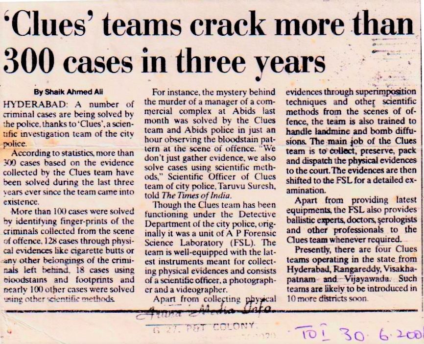 At present in Andhra Pradesh has 109 Crime Spots mobile teams are functioning with latest scientific gadgets and trained police personals. These teams are functioning in the control of SDPO. I’m acting as Technical In-charge for these Teams for Training and clarifying the doubts of Investigating Officers and the team members. The main challenges are these trained personnel are not dedicatedly allotted to work in the teams. They are attending all types of station duties and if they transferred or promoted there is no alternative person in their place. All team member needs lot of forensic knowledge in crime scene reconstruction, handling, lifting and packing of physical evidence techniques and skills. For that our DGP sir is taking adequate steps for training and strengthening the CLUES Teams to serve the common man.